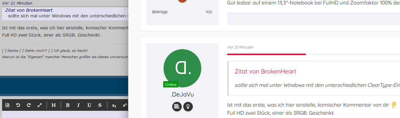 • Hat ja auch niemand von dir verlangt.. Ich empfinde 14px einfach als angenehmer zu lesen. in diesem Forum, es gibt auch Foren, die ich lieber bei 110% lese, weil die 12px nutzen.