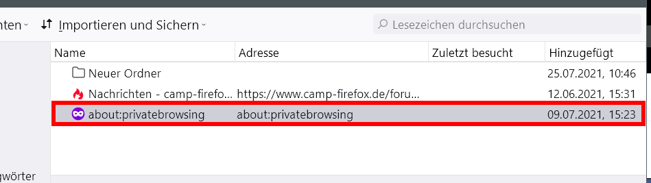 In dem besagten Fenster sind markierte Einträge gelb gepunktet umrandet.