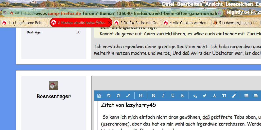 • So kann ich mich einfach nicht dran gewöhnen, daß geöffnete Tabs oben, und nicht direkt über dem Inhaltsfenster erscheinen. Ich hatte das auch geändert (userchrome), aber das hat es mir wohl auch irgendwie zerschossen. Werde mal hier im Forum schauen, ob ich hier den entsprechenden Code finde. Aber Hauptsache es läuft erst mal wieder.