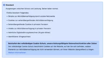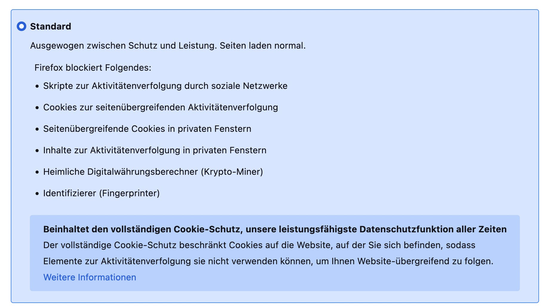 Aktivierung des vollständigen Cookie-Schutzes im normalen Modus angeboten.