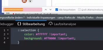 Alles anzeigen#urlbar-input::selection { background-color:#058b00 !important; color:#0c0c0d !important; } #urlbar-container { --toolbar-field-focus-border-color:#486860 !important; } #urlbar:focus-within #urlbar-input-container { background-color:rgba(255, 233, 0, 0.1) !important; }wer jetzt noch den MarkiertenText auf Websiten geändert haben möchte der macht einfach folgendes