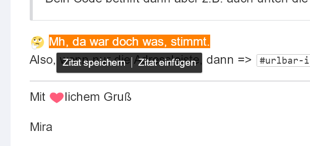 Mh, da war doch was, stimmt.Also, wenn nur die Adressleiste, dann => #urlbar-input::selection