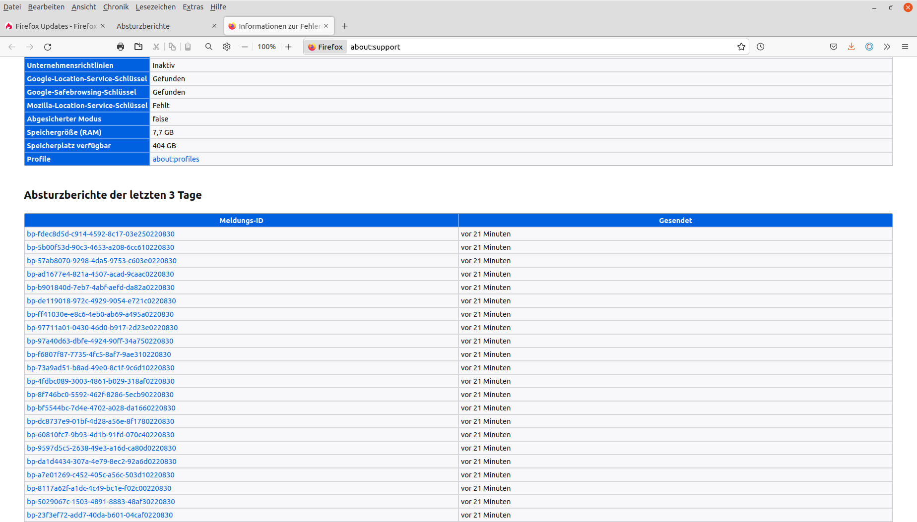 Zum Einen stürzen neu geöffnete Tabs ab und ich werde aufgefordert Firefox neu zu starten. Äußerst unangenehm bei laufender Arbeit.