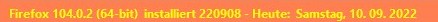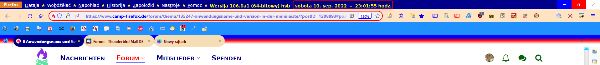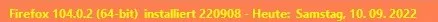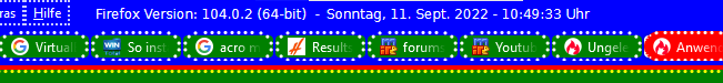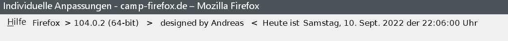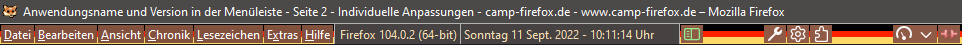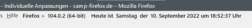 Alles anzeigen(function() { function doDatClock() { var timestr = new Date().toLocaleDateString(locale, options); const blanks = ' der'; let i = timestr.lastIndexOf(','); timestr = timestr.substring(0, i)+ blanks + timestr.substring(i + 1) + ' Uhr'; if (count == 1) { var counter = new Date(1000 * sec).toISOString().substr(11, 8); // .replace(/^[0:]+/, '') // if you want to replace zeroes and colons timestr = timestr + ' (' + counter + ')'; sec++; } ClockLabel.setAttribute('value', timestr); } var count = 0; // if you don't want a counter set this to zero var agent = 1; // if you just want the clock set this to zero var language = 'de-DE'; // locale, e.g. 'de-DE' , 'en-US' , 'fr-FR' var personalText = ' Heute ist'; // your personal text here var cssFontFamily = 'DejaVu Sans'; var cssColor = 'black'; // Font Color var bitnr = ` (${Services.appinfo.is64Bit ? 64 : 32}-bit)`; var css = 'padding-top: 5px; padding-left: 0;margin-right:2px;margin-left:4px; color: ' + cssColor + '; font-family: ' + cssFontFamily + '; font-weight:500; font-size:12px; text-shadow: none; width: 340px;'; var cssA = 'width: auto;'; var options = { weekday: 'long', year: 'numeric', month: 'long', day: 'numeric', hour: '2-digit', minute: '2-digit', second: '2-digit' }; var sec = 0; var locale = language || window.navigator.languages[0]; var position = document.getElementById('helpMenu'); // Datumsangabe in Menüleiste // var position = document.getElementById('urlbar-container'); // Datumsangabe in Symbolleiste hinter Adressleiste var ClockLabel = document.createXULElement('label'); ClockLabel.setAttribute('id', 'statusbar-clock-display'); ClockLabel.setAttribute('class', 'statusbarpanel-text'); ClockLabel.setAttribute('style', css); position.parentNode.insertBefore(ClockLabel, position.nextSibling); if (agent == 1) { var AgentLabel = document.createXULElement('label'); AgentLabel.setAttribute('id', 'statusbar-agent-display'); AgentLabel.setAttribute('class', 'statusbarpanel-text'); AgentLabel.setAttribute('style', css + cssA); var FFstr = window.navigator.userAgent.split(' '); var FF = FFstr[FFstr.length - 1].replace('/', ' '); // var text = "Firefox " + gAppInfo.version + personalText; // Cc["@mozilla.org/xre/app-info;1"].getService(Ci.nsIXULAppInfo).QueryInterface(Ci.nsIXULRuntime); var text = "Firefox > " + AppConstants.MOZ_APP_VERSION_DISPLAY + bitnr + personalText; AgentLabel.setAttribute('value', text); position.parentNode.insertBefore(AgentLabel, position.nextSibling); } if (count == 1) { ClockLabel.addEventListener('dblclick', function() { sec = 0; }); } window.setInterval(doDatClock, 1000); })();Die Werte müssen evtl. noch angepasst werden.