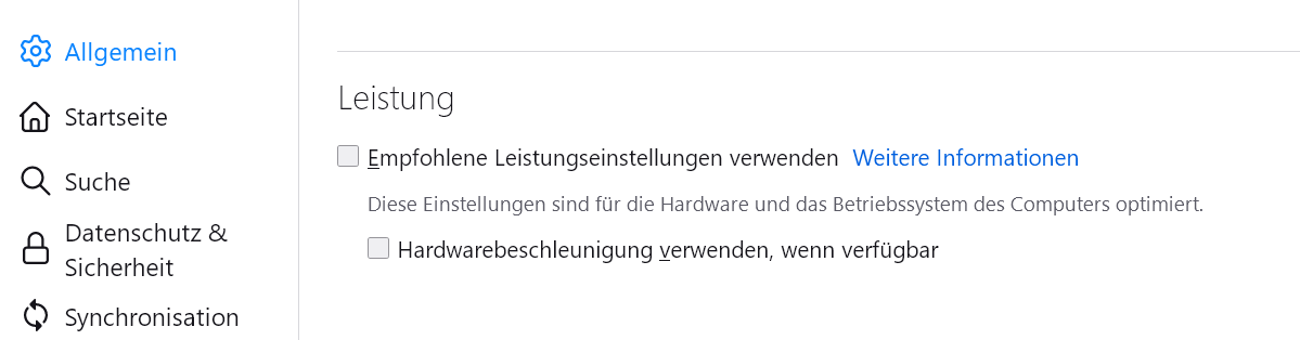 Als Versuch deaktivierte ich die Hardwarebeschleunigung - ohne Erfolg.