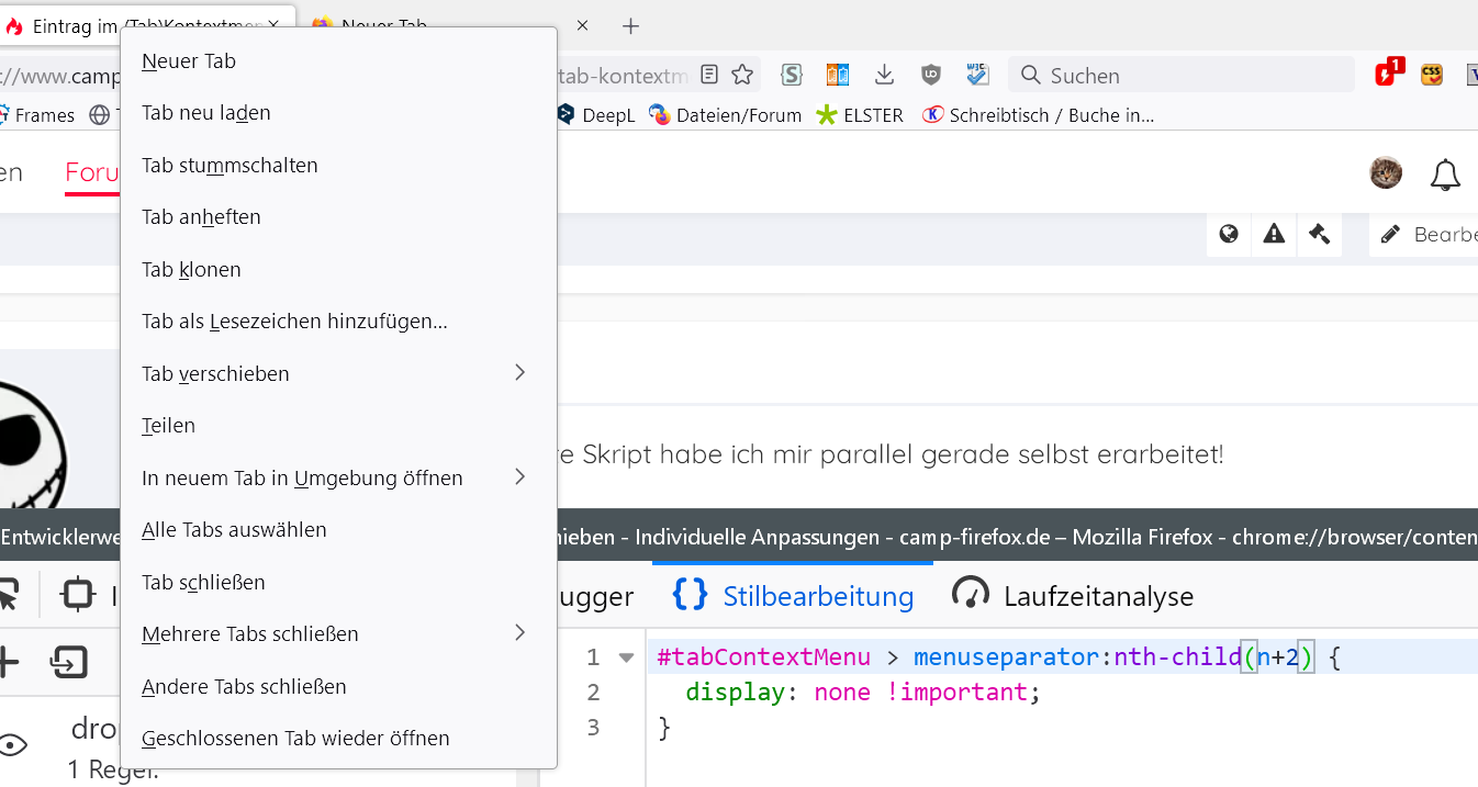 1. Der Seperator ist "#tabContextMenu > menuseparator:nth-child(31)"