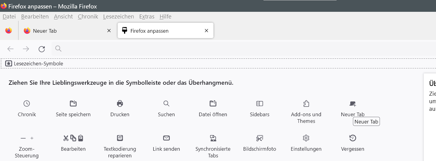 Mit dem Update auf FF 106.01 (Win 10) vermisse ich das „+“ neben den Tab-Reiter, womit ich einen neuen Tab aufmachen konnte. Hätte gerne diese Funktion wieder!