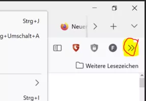 Das gezeigte Menü ist vollständig, und installiert ist G-Data (Symbol der Erweiterung zu sehen). Die Größe könnte von der Windows-Desktop-Auflösung in % herrühren, wobei sich das bei einem Update des Grafikkatentreibers nicht ändern sollte.