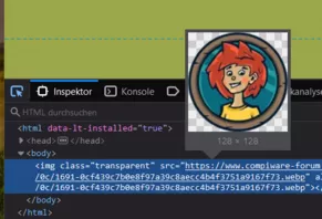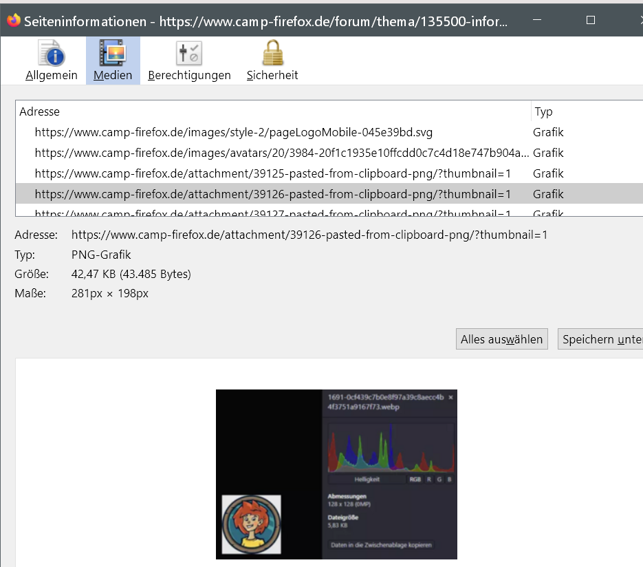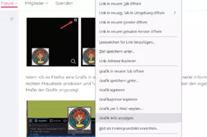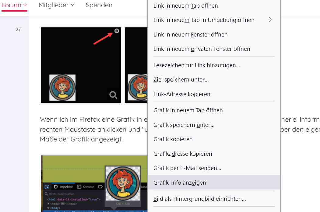 Wenn ich im Firefox eine Grafik in einem neuen Tab öffne, dann gibt es dort keinerlei Informationen. Ich muss diese erst mit der rechten Maustaste anklicken und "untersuchen". Fahre ich dann mit der Maus über den eigentlichen Link zur Grafik, werden mir die Maße der Grafik angezeigt.