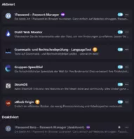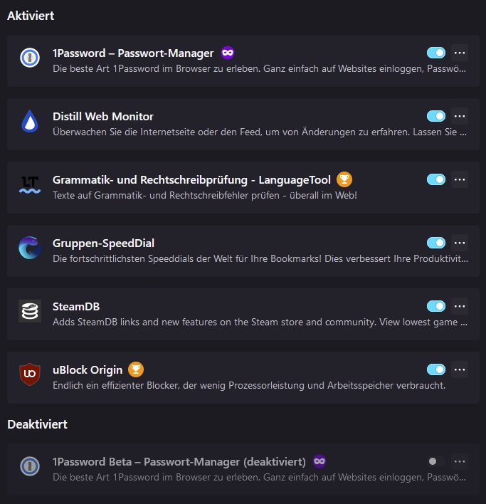 Aktuell habe ich 7 Erweiterungen installiert, wovon 1 Erweiterung deaktiviert ist.