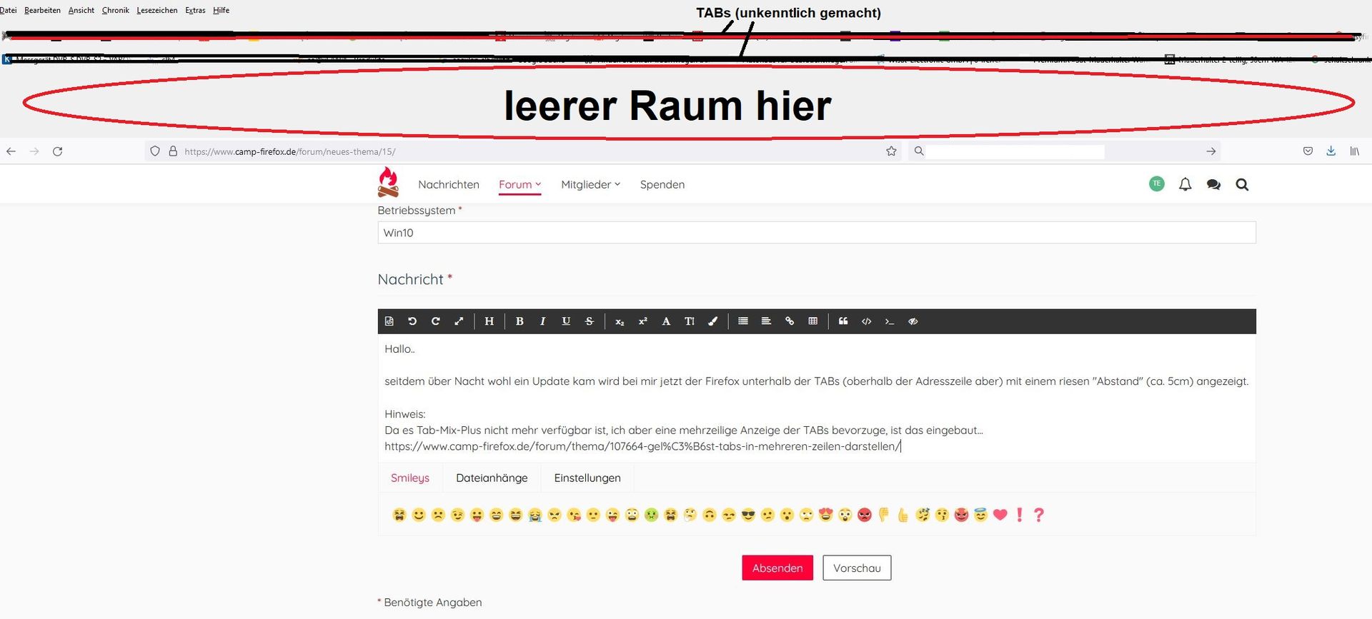 seitdem über Nacht wohl ein Update kam wird bei mir jetzt der Firefox unterhalb der TABs (oberhalb der Adresszeile aber) mit einem riesen "Abstand" (ca. 5cm) angezeigt.