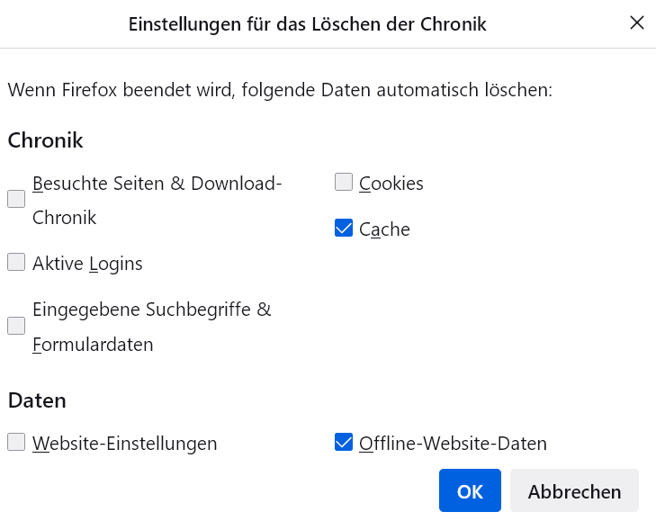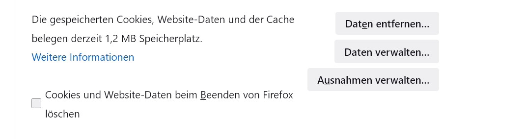 Ich weiß, dass man Ausnahmen eingeben kann, wenn man die Cookies immer beim Beenden von FF löschen lässt. Diese Funktion hat aber in der Vergangenheit zu Problemen geführt (ich bin mir nicht mehr ganz sicher, aber ich glaube, das war auf der Seite Beck online). Ich habe jetzt schon die Cookies immer von Zeit zu Zeit "zu Fuß" gelöscht und die, die bleiben sollten, beibehalten. Das ist auf die Dauer gesehen ziemlich aufwendig. Andererseits nehmen die Cookies von drei Tagen schon einen Umfang von 1 GB ein. Das erscheint mir viel, deshalb lösche ich, wenn ich meine, es wäre mal wieder dran.