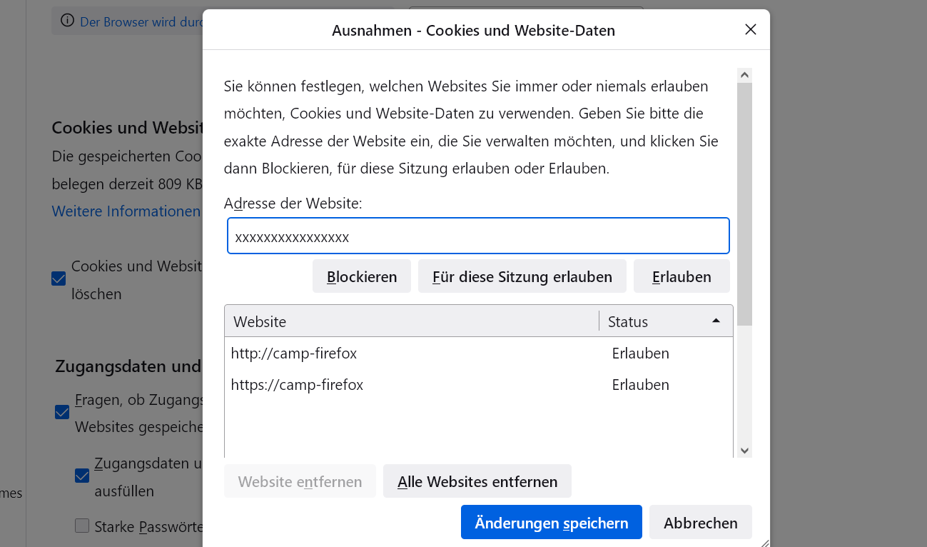 Ich lasse generell die Cookies beim Schließen des Browsers löschen. Jetzt benötige ich die erste Ausnahme. Aber die lässt sich nicht über das schließen des Browsers hinaus speichern. Was kann man da denn machen?