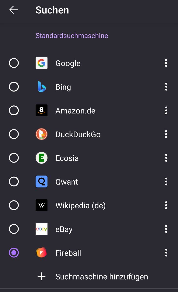 die Fireball-Suchmaschine zu Firefox hinzugefügt.