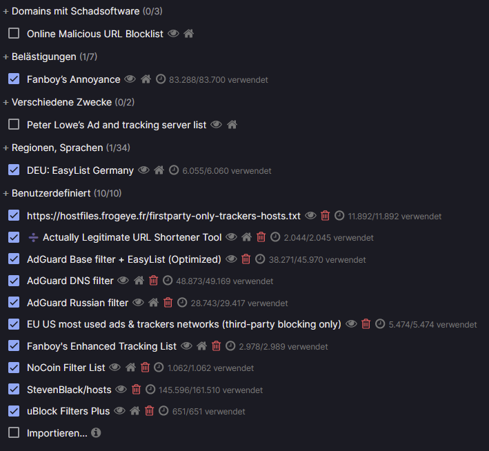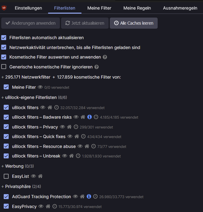 Ich muss ehrlich gestehen, dass ich mich mit uBlock Origin und dessen Einstellungen noch nicht so gut auskenne. Allerdings habe ich mir auf Anraten ein paar Filterlisten hinzugefügt und einige entfernt.