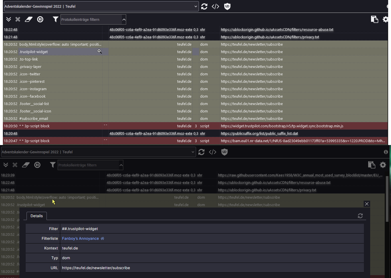 • Ich bin überrascht, dass zwar viele uBlock nutzen, aber nicht wissen, wie man ermittelt, welcher Filter zuständig ist.