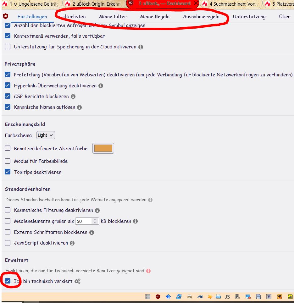 und dann einfach mal mit den rot eingekreisten Dingen oben beschäftigen... Ausnahmen kann man hinzufügen, mit der Lupe passgenau Filter setzen und z.B. Webseiten "säubern"..