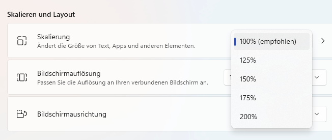 Auflösung ist 3840 x 2160 und Skalierung 150%.