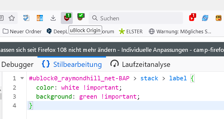 mit folgendem Code habe ich bisher Icons in der Symbolleiste geändert. Hier ein Beispiel. Der Code funktioniert seit Firefox 108 nicht mehr: