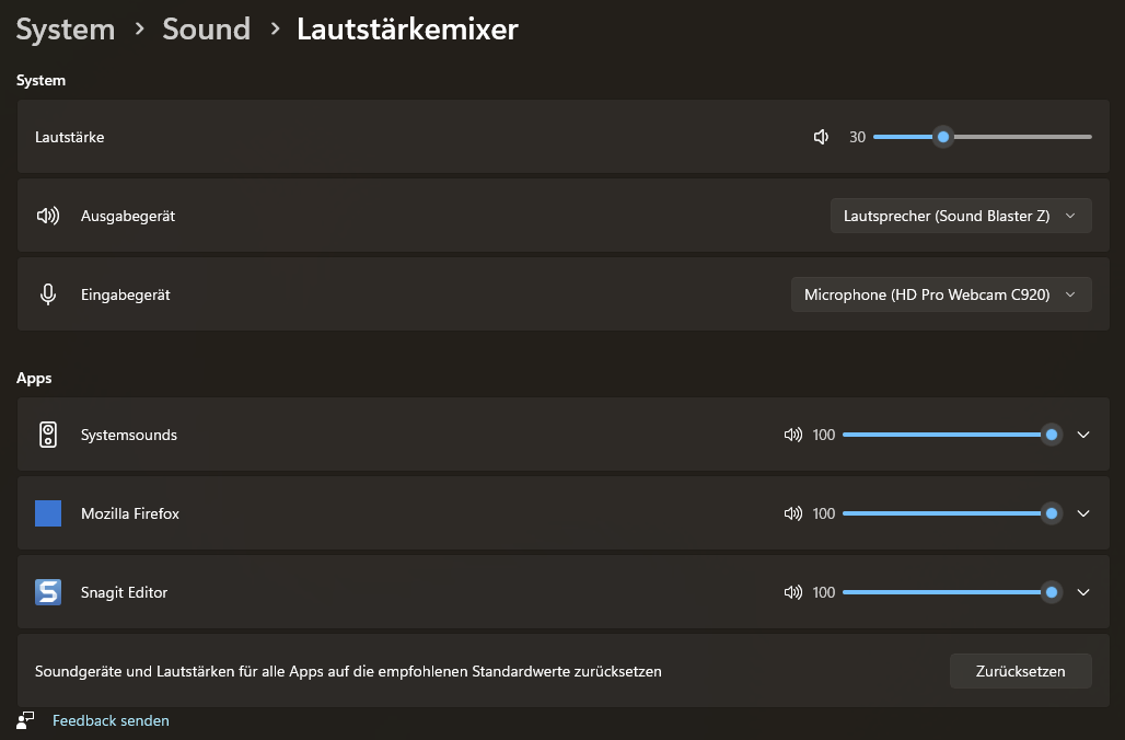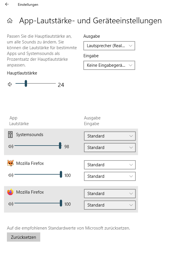 Die unter https://support.mozilla.org/de/kb/video-un…robleme-windows beschriebenen Fehlerbehandlungen habe ich (soweit bei mir relevant) bereits durchgeführt. Der Lautstärkeregler im Windows Soundmixer steht bei Firefox auf maximum. Die Tabs sind nicht stummgeschaltet. Das Soundgerät ist korrekt installiert. Ich habe ebenfalls den Browser komplett ohne Adons neu installiert, doch das Problem bleibt bestehen und ich bin mit meinem Latein am Ende.