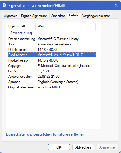 ich habe das Problem zwar nicht. Die Antwort dürfte aber sehr einfach sein. MSVC installiert die DLL in den Systemordner (%SystemRoot%\System32), während der Fx sie in seinem eigenen Programmordner erwartet. Zudem stammt diese DLL hier von MSVC Version 17: