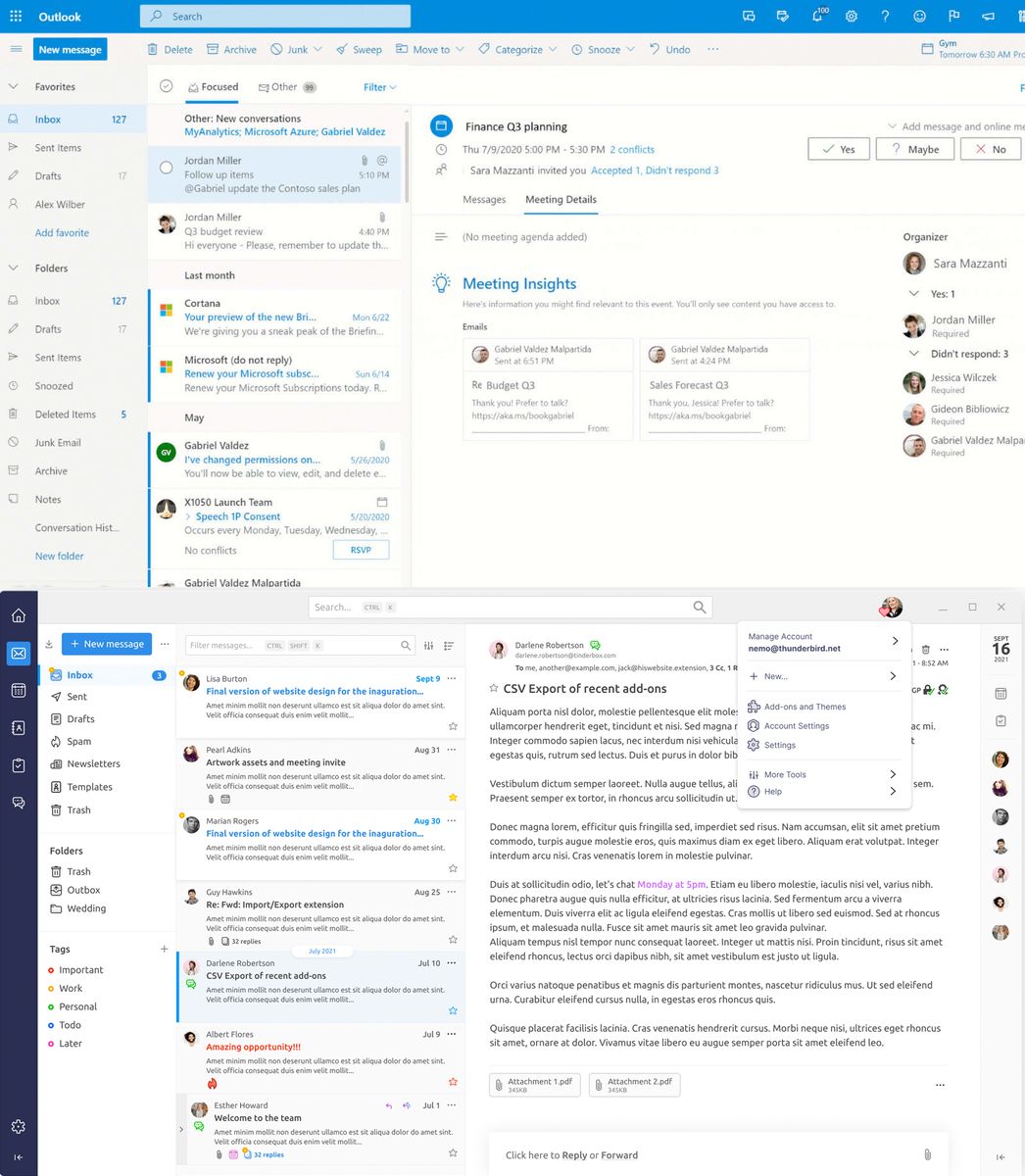 Hier mal ein Screenshot, der Outlook oben und das Thunderbird-Mockup unten zeigt. Im direkten Vergleich wird ganz deutlich, was ich meine:
