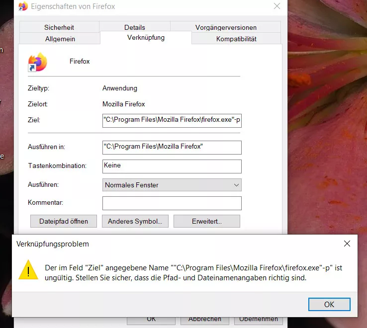Setze mal Leerzeichen plus -p innerhalb der Anführungszeichen. Ich habe keine Anführungszeichen hier, da mein Pfad keine Leerzeichen enthält.