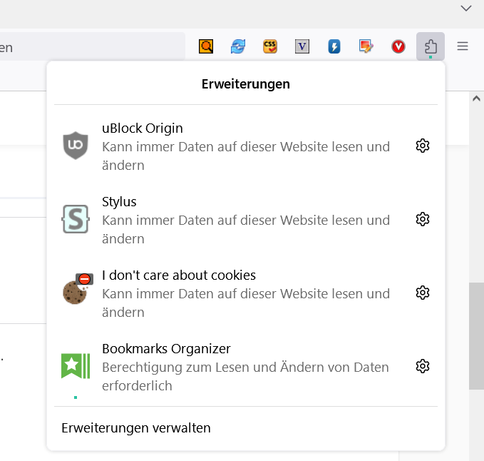 nach dem Update auf Fx109.0 sind alle Addon-Button aus dem Erweiterungsmenü verschwunden und auch im Pool von "Symbolleiste anpassen" gibt es keine Addon-Button mehr und es können auch keine mehr dorthin verschoben werden. Das Hinzufügen geht nur über den neuen Addon-Button. Die vorhandenen Buttons können auch nicht mehr ins Überhangmenü verschoben werden, sondern nur noch per Klick auf "an Symbolleiste anheften" entfernt werden.