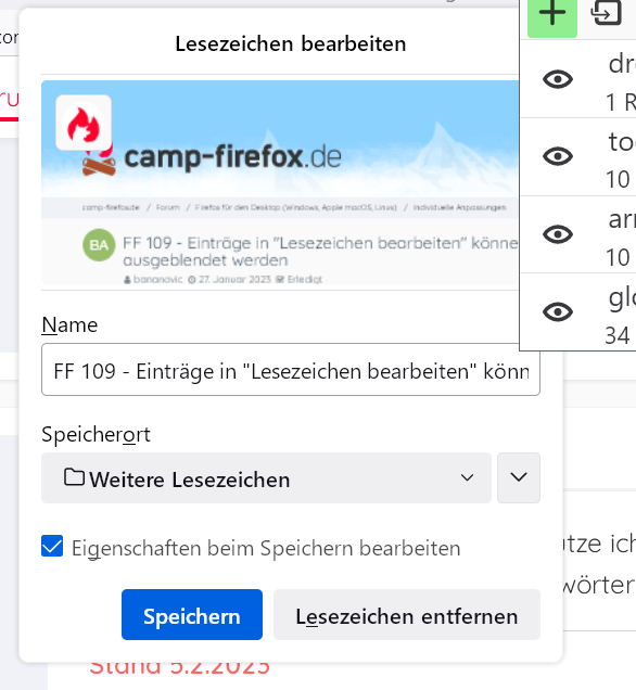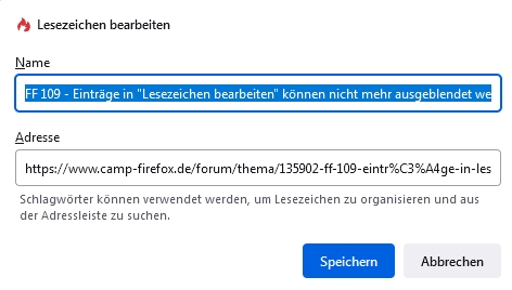 Bisher hatte ich im Feld "Lesezeichen bearbeiten" die Einträge Schlagwörter und Schlüsselwort mit folgendem Code in der userChrome.css ausgeblendet: