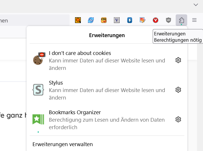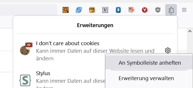 Einzig die Add-ons Symbole oben re. oberhalb der Lesezeichen-Symbolleiste bekomme ich da nicht rein, da waren bislang zwei, der Video DownloadHelper und Adblock Plus platziert.