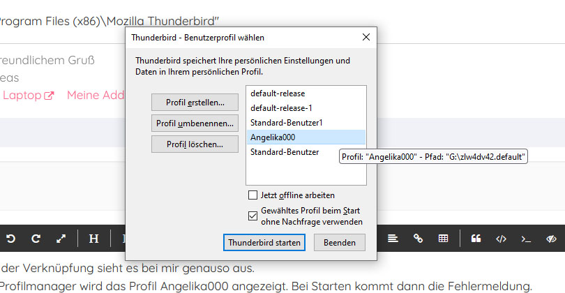 Übrigens startet das Profil Angelika111 jetzt problemlos. Aber eben nicht mit der Verknüpfung.