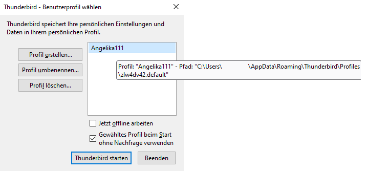 Also müsste "...\thunderbird.exe" -p dir eine Auswahl anbieten und dort kannst du "Agelika111" auswählen.