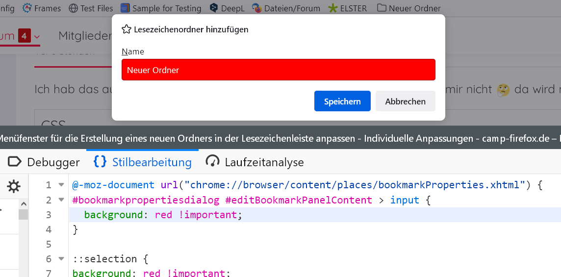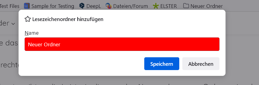 Eingabefeld in Menüfenster für die Erstellung eines neuen Ordners in der Lesezeichenleiste anpassen