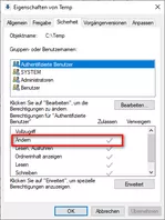 Sollten die Rechte jedoch richtig gesetzt sein (im Bild trifft das für alle Nutzer so zu, wie gezeigt), und dennoch Löschen nicht möglich sein, dann hat ein anderer Prozess Zugriff auf diese Daten und dieser Prozess muss ermittelt und beendet werden.