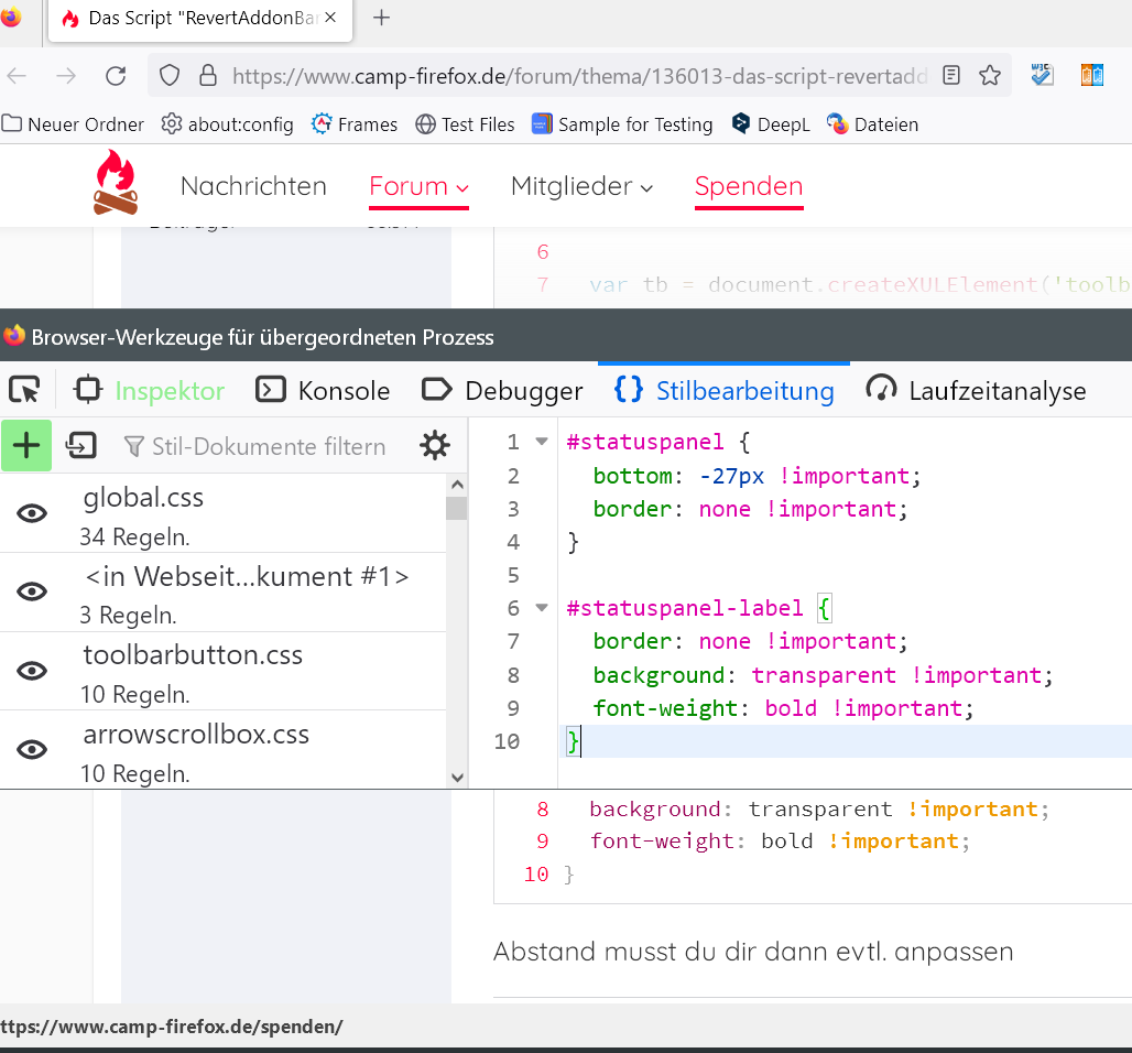 Diesen Code gab es auch schon bisher als das Script RevertAddonBarStatusBar.uc.js noch funktioniert hat. Nur heißt der Selector jetzt nicht mehr bottom-toolbar sondern new-toolbar.