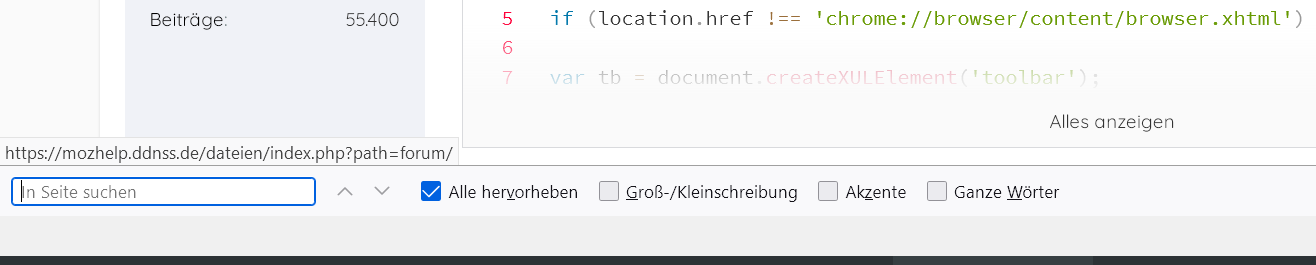 • Ich muß gestehen, daß ich das Script von Andreas übersehen habe. Ich habe nur den CSS Code gesehen. Der allein hats nicht gebracht. Jetzt habe ich das Script getestet. Es funktioniert. Es wird wie gewünscht eine permanente Statusleiste erzeugt (oder wie man die bezeichnen will), welche die Url gewissermaßen nach oben verschiebt. Aber nicht nur das, diese permanente Statusleiste verschiebt auch eine temporäre Stausbar, wie z.B. die Suchfunktion mit F3, nach oben und darüber die Url. Die Roboform-Leiste verdeckt die permanente Statusleiste. So kann die Roboform-Leiste aktiviert bleiben und ich sehe dennoch darüber die Suchfunktion und darüber die Url. Das ist sehr praktisch, besser als vorher.
