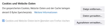 Ich habe im FF die Option "Cookies und Website-Daten beim Beenden von Firefox löschen" aktiviert, manchmal lösche ich die Cookies auch zwischendurch manuell über "Neueste Chronik löschen".