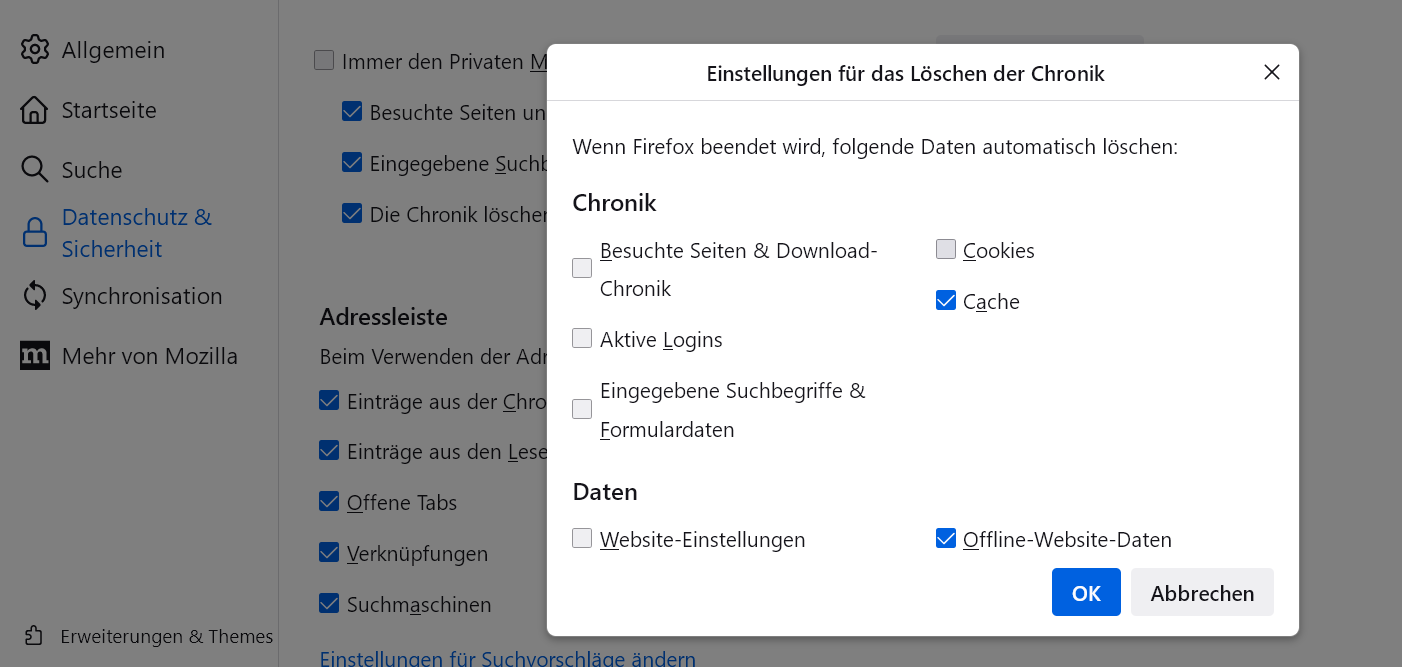 Cookies beim Beenden löschen auch für zugelassene Websites