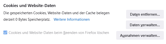 Für Websites, die aber Cookies zwingend benötigen und die man regelmäßig besucht, ist es nicht zweckmäßig, jedesmal manuell Cookies wieder zu aktivieren, also stelle ich es für diese in den Ausnahmen ein.