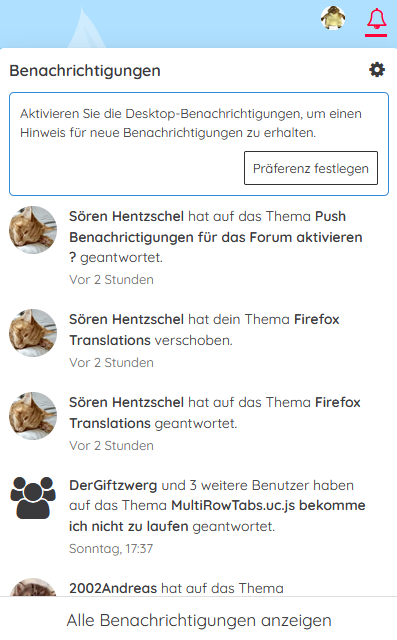 Im neuen Firefox 111.0 gibt es ja nun die Push Benachrichtigungen auch für Windows und ich würde sehr gerne diese für das Forum hier aktivieren, nur leider finde ich keine Option dafür hier im Forum. Ich würde nämlich gerne ohne angemeldet zu sein hier die Benachrichtigungen in mein Windows bekommen um dann nachzulesen was im jeweiligen Thread geschrieben wurde.