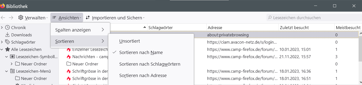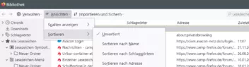 Heißt, wenn die Lesezeichen im Menü alphabetisch sortiert erscheinen, sind sie das auch bei Aufruf der Bibliothek, auch wenn da "unsortiert" aktiv ist... ![]()