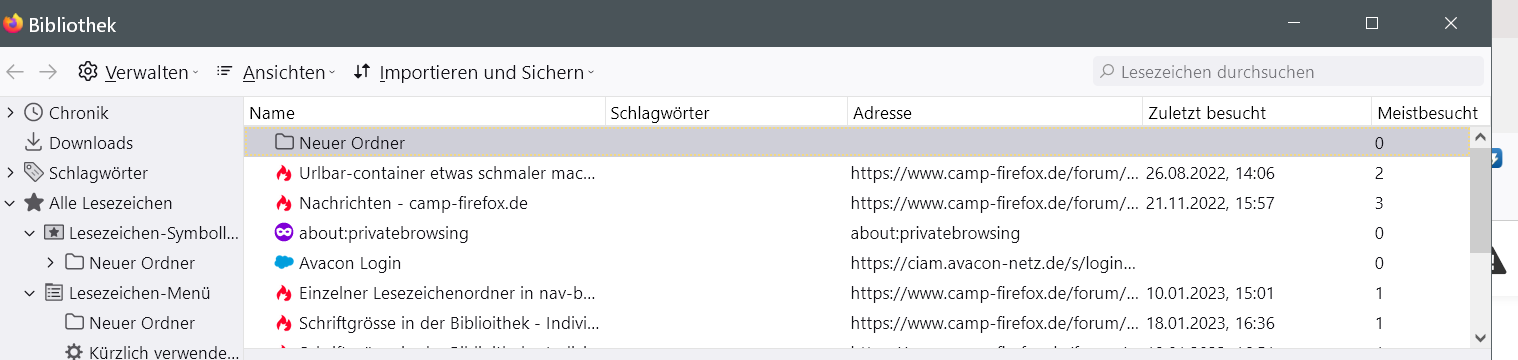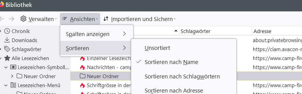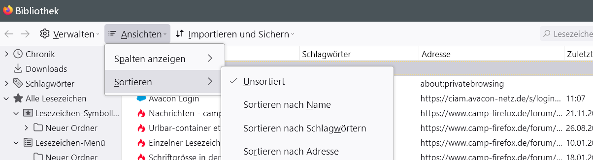 Heißt, wenn die Lesezeichen im Menü alphabetisch sortiert erscheinen, sind sie das auch bei Aufruf der Bibliothek, auch wenn da "unsortiert" aktiv ist... ![]()