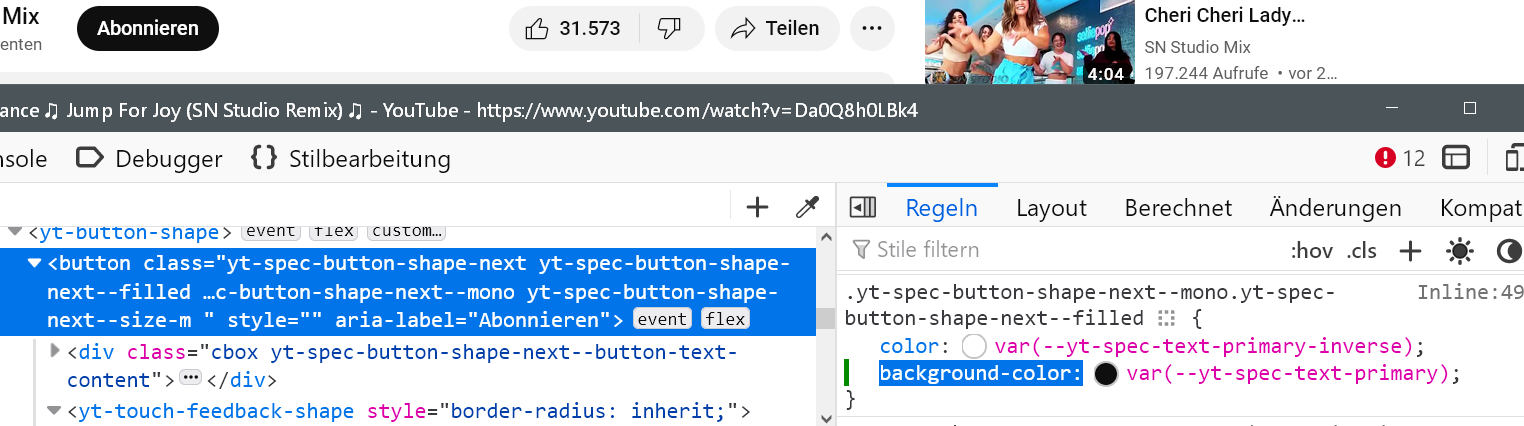 Alles anzeigen@-moz-document domain("youtube.com") { .yt-spec-button-shape-next--mono.yt-spec-button-shape-next--filled { background-color: pink !important; /* Fläche */ color: blue !important; /* Schrift */ } ytd-subscribe-button-renderer.ytd-watch-metadata > div:nth-child(3) > ytd-subscription-notification-toggle-button-renderer-next:nth-child(1) > yt-button-shape:nth-child(1) > button:nth-child(1) { background: red !important; color: white !important; } }