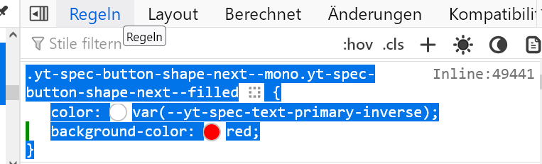 Code.yt-spec-button-shape-next--mono.yt-spec-button-shape-next--filled { color: var(--yt-spec-text-primary-inverse); background-color: red; }und in deine Datei bzw. Stylus..userContent.css wieder einfügen.