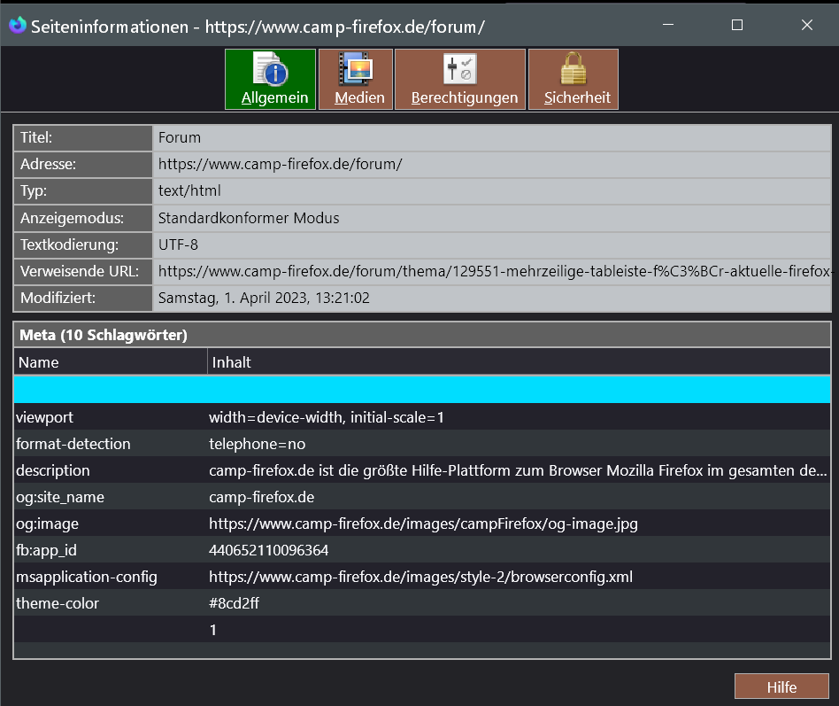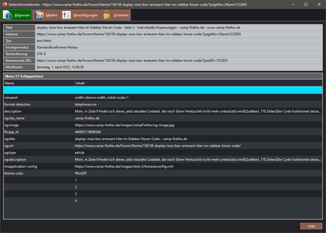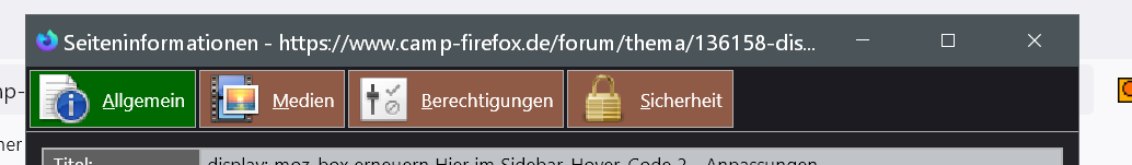 Alles anzeigen@-moz-document url("chrome://browser/content/pageinfo/pageInfo.xhtml") { #topBar { border-bottom: 1px solid #B2B2B2 !important; background: #1C1B22 !important; padding-inline-start: 2px !important; } #viewGroup { padding-inline-start: 0 !important; } #viewGroup > radio > .radio-label-box { /* -moz-box-orient: horizontal !important; */ flex-direction: row !important; } .radio-label { text-align: center !important; } #topBar radiogroup > radio { border: 1px solid #B2B2B2 !important; background: #905B46 !important; color: #FFF !important; padding: 2px 0 !important; margin: 2px 2px 2px 0 !important; } #topBar radiogroup > radio[selected] { background: #006800 !important; color: #FFF !important; } #topBar radiogroup > radio .radio-label { margin-inline-start: 8px !important; } #topBar radiogroup > radio:hover, #topBar radiogroup > radio[selected]:hover { border: 1px solid #0082FC !important; background: #D1E2F2 !important; color: #000 !important; } vbox > hbox > button { appearance: none !important; border: 1px solid #B2B2B2 !important; background: #905B46 !important; color: #FFF !important; padding: 2px 5px !important; margin: 2px 2px 2px 0 !important; } vbox > hbox > button:hover { border: 1px solid #0082FC !important; background: #D1E2F2 !important; color: #000 !important; } #mainDeck { background: #232327 !important; } table { border: 2px solid #B2B2B2 !important; border-bottom: 0 !important; } table#mediaTable { margin-bottom: 9px !important; } #securityPanel > table { margin-bottom: 0 !important; } table th { background: #606060 !important; border-right: 2px solid #B2B2B2 !important; border-bottom: 2px solid #B2B2B2 !important; } table td { background: #C0C4C8 !important; border-bottom: 2px solid #B2B2B2 !important; } table th label { color: #FFF !important; } table td, table td input { color: #000 !important; } .tableSeparator { height: 0 !important; } #permHostBox #hostText { appearance: none !important; border: 2px solid #B2B2B2 !important; border-bottom: 0 !important; border-left: 0 !important; background: #606060 !important; color: #FFF !important; padding: 2px 5px !important; margin: 0 !important; } #securityPanel > groupbox { margin: 0 0 10px 0 !important; } treecols[slot="treecols"] { border-bottom: 2px solid #B2B2B2 !important; } #metaTagsCaption, groupbox > label, groupbox > description, deck > vbox > hbox > label { border: 2px solid #B2B2B2 !important; border-bottom: 0 !important; background: #606060 !important; color: #FFF !important; padding: 2px 5px !important; margin: 0 !important; } groupbox { border-bottom: 2px solid #B2B2B2 !important; } #metatree, #permList, #imagetree, #imagecontainerbox { appearance: none !important; border: 2px solid #B2B2B2 !important; background-color: #31363A !important; margin: 0 0 10px 0 !important; } #imagetree { min-height: 16.3em !important; } #imagecontainerbox { margin: 7px 0 10px 0 !important; } }die Anpassungen benötigt man für Nightly 113.x.