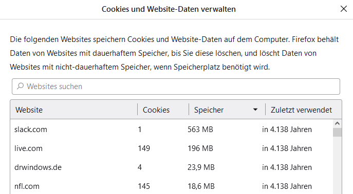 seit dem Update auf FF 112 werde ich nach jedem Browserneustart auf vielen Webseiten ausgeloggt. Wie ihr im Anhang sehen könnt, stimmen die Zeitangaben bei den Website-Daten nicht. Ich dachte, es würde vielleicht helfen die zu löschen, aber das ändert leider nichts an dem Problem. Es gibt Seiten, da stimmt die Zeitangabe und ich werde trotzdem ausgeloggt und bei anderen ist sie falsch aber ich bleibe eingeloggt. Habt ihr irgendeine Idee dazu bzw. so etwas schonmal mitbekommen? Ich habe leider nichts gefunden.