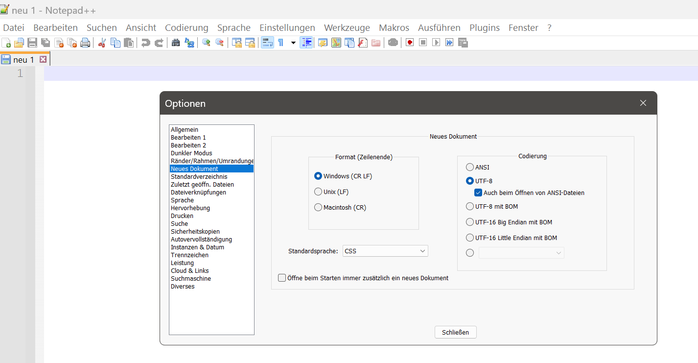Aber: Sucht mal ein Skript oder eine Stildatei, die weder Umlaute noch Eszett enthalten (und auch auch nicht in einer sorbischen Sprache ist ;)) und schaut in die Statusleiste von Notepad++, was dort als Kodierung steht. Bei mir ANSI. Und wenn ich dann eine deutschsprachige Ergänzung mache, die dann ein Zeichen außerhalb von ANSI enthält, muss ich daran denken, explizit in UTF-8 abzuspeichern. Genau das ist mir schon mehrmals auf die Füße gefallen.
