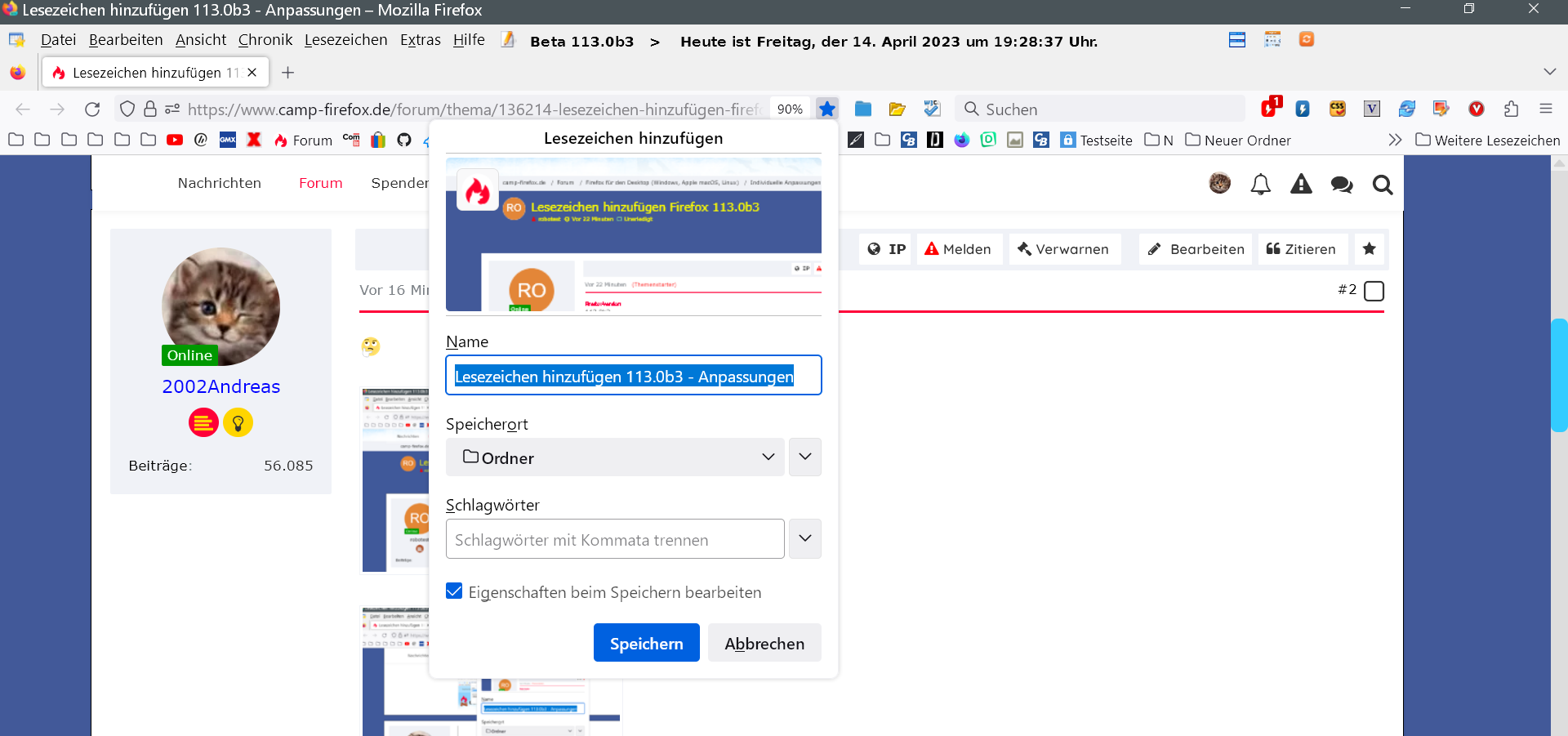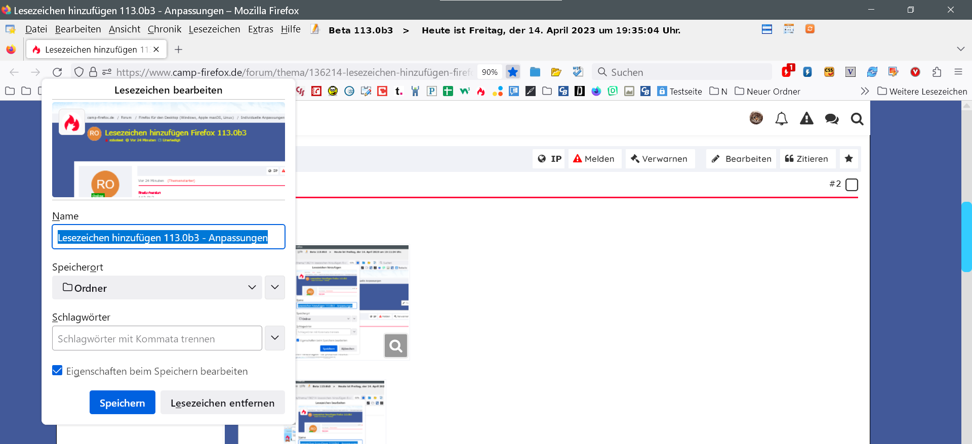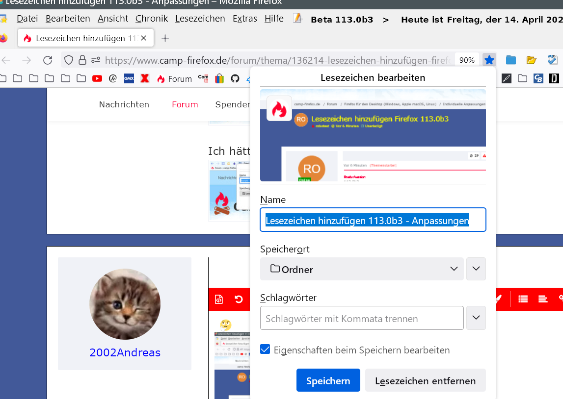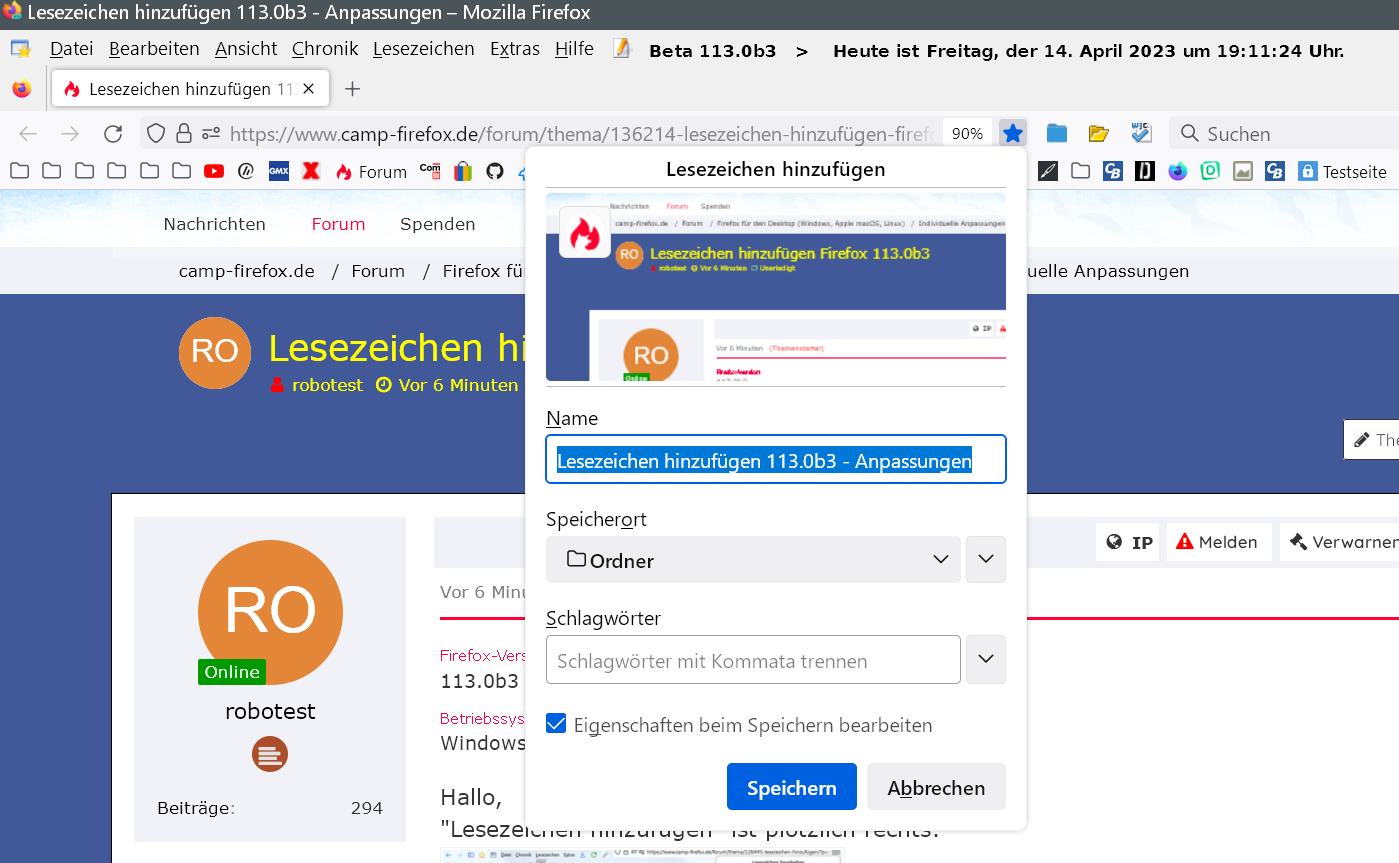 Lesezeichen hinzufügen Firefox 113.0b3