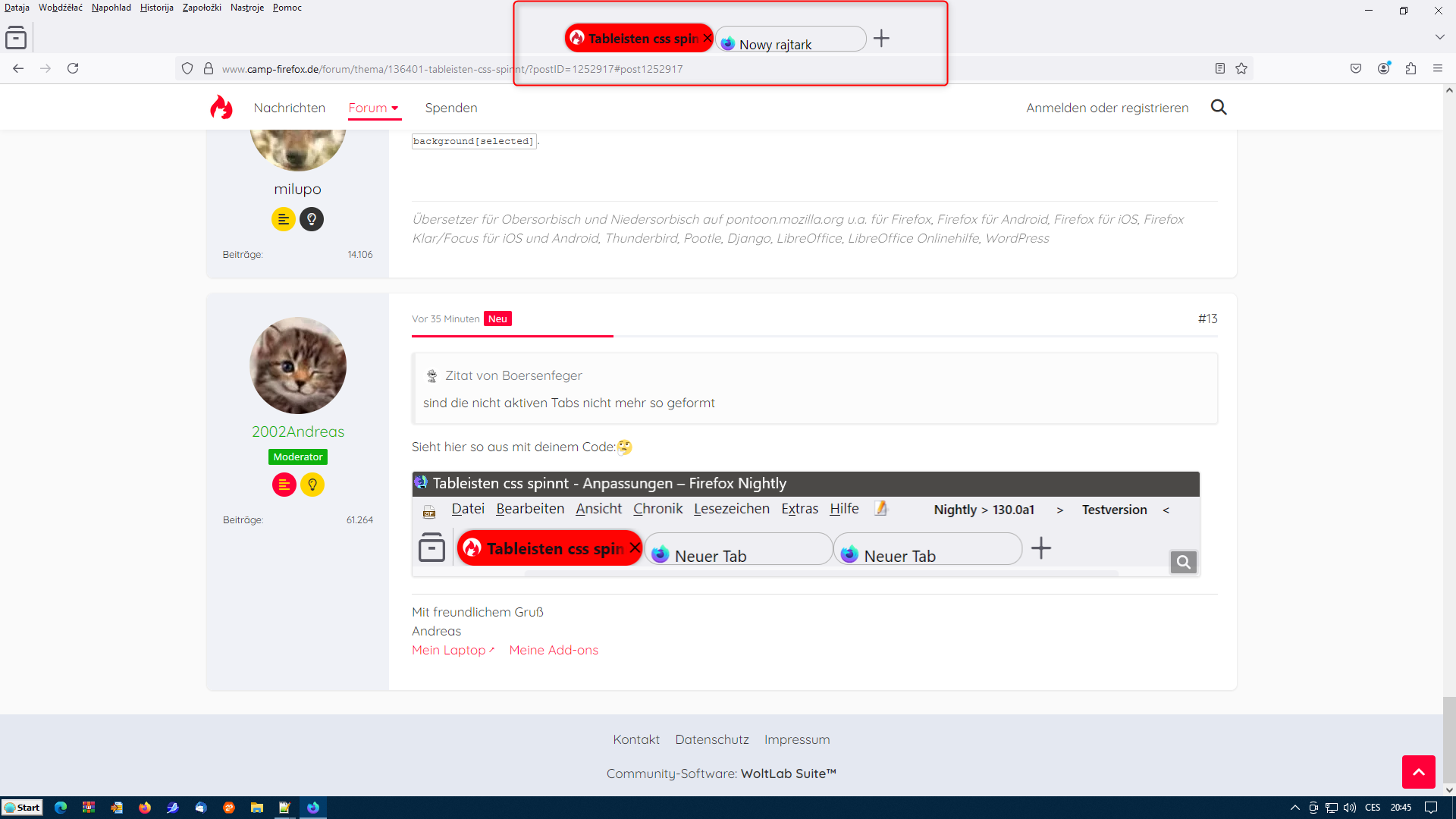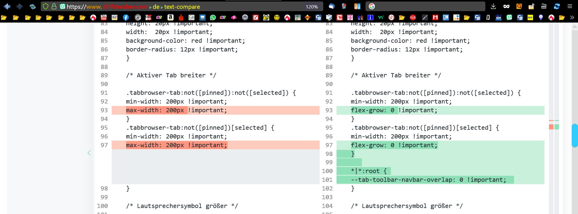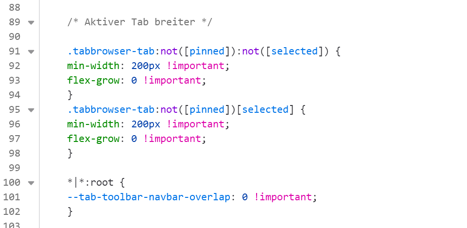 In Zeile 96-97 stand vorher 237px. Nachdem Neustart sieht die Tableiste nach Schließen eines Tabs jetzt so aus: