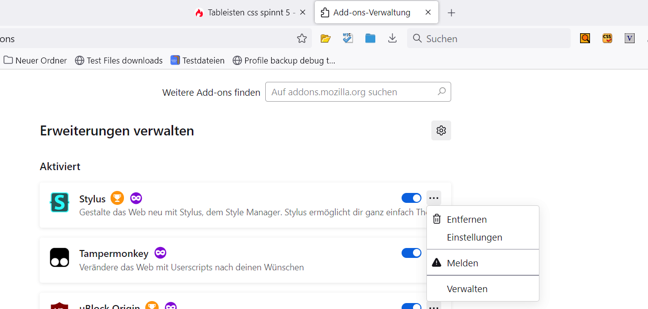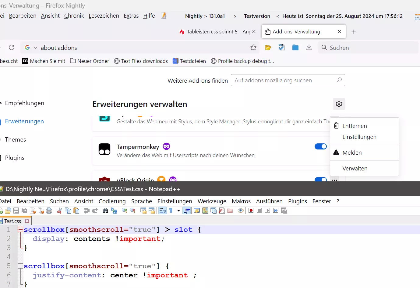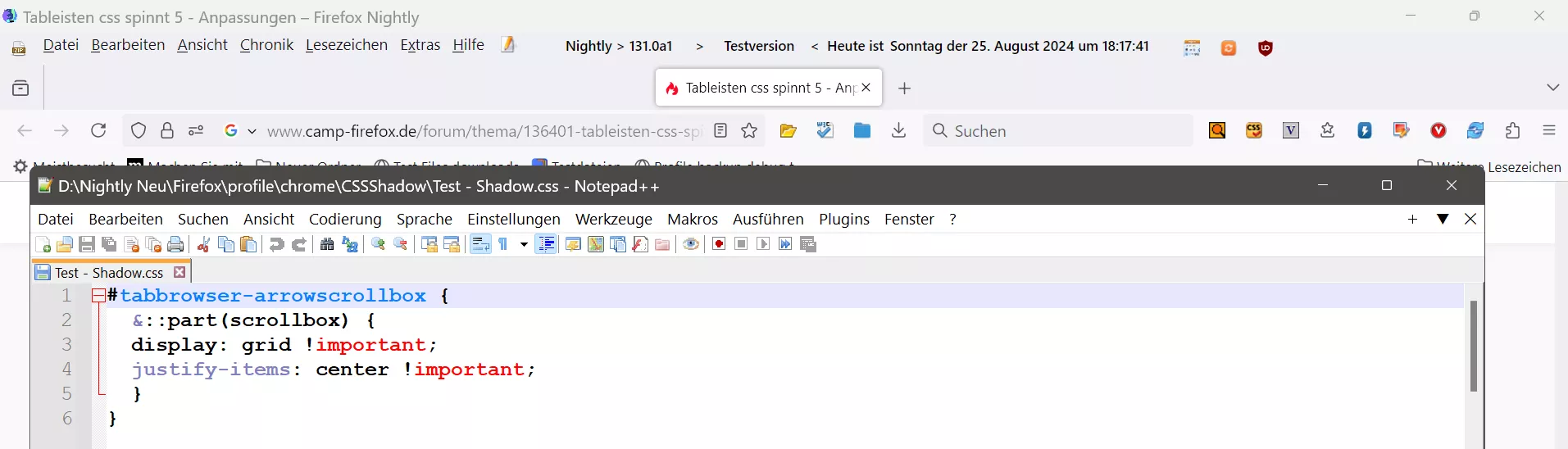 Die Lösung aus #79 bewirkt hier in der userChromeShadow.css nichts, der Code von FuchsFan aus #93 in der userChrome.css läßt die Tabs zusammengestaucht oberhalb der Menüleiste landen. Diese werden hier mit einem eigenen css unter die Menü-Leiste verfrachtet. Wenn ich dann den dafür zuständigen Code ebenfalls in die userChrome.css packe, ist es nicht mehr gestaucht aber immer noch oberhalb der Menü-Leiste.
